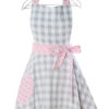 Delantal con peto, con doble falda acampada, la capa inferior, lazos y coordinados, está confeccionado en un tejido piqué rosa palo con topos gris perla y la capa superior y peto, esta confeccionado en un vichy con un acabado suave a cuadros blancos y grises. Lleva un bolsillo en el lado derecho en formas de corazón. Es un elegante diseño que evoca el glamour de los años 50. Talla: Única Tejido: piqué poliester/algodón